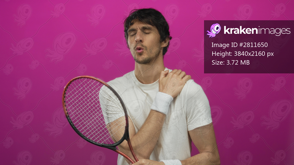 Man tennis player holds tennis racket and touches left shoulder in studio after practice serve; tension.