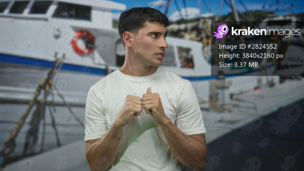 Man with tense expression holds fists near chest beside white boat on street; anxiety readiness tension worry.