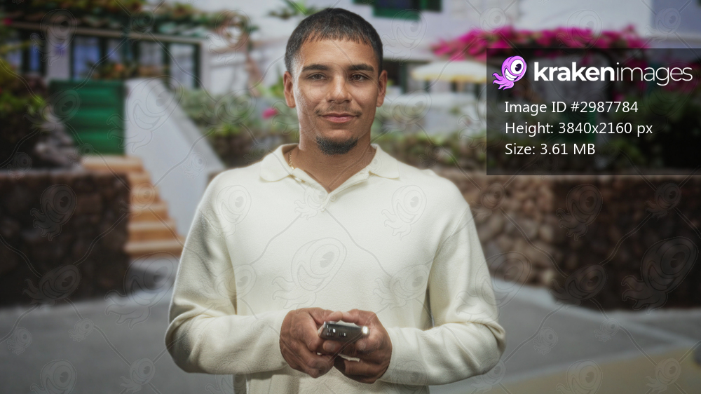 Man texting on smartphone, hands and thumbs tapping the screen while standing near building stairs and stone wall, smiling and looking down; connection contentment. - Kraken Images