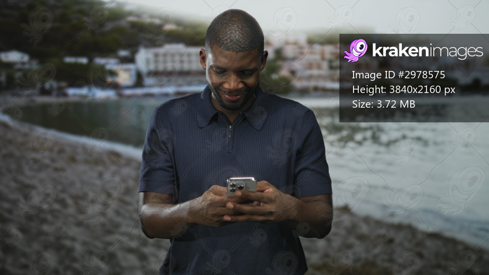 Man texting on smartphone, thumbs typing with bare hands, smiling in navy polo on beach by seaside buildings; quiet contentment.