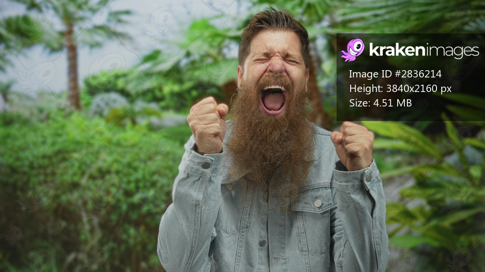 Man with thick beard clenches both fists and shouts under bright green trees in park; excitement victory.