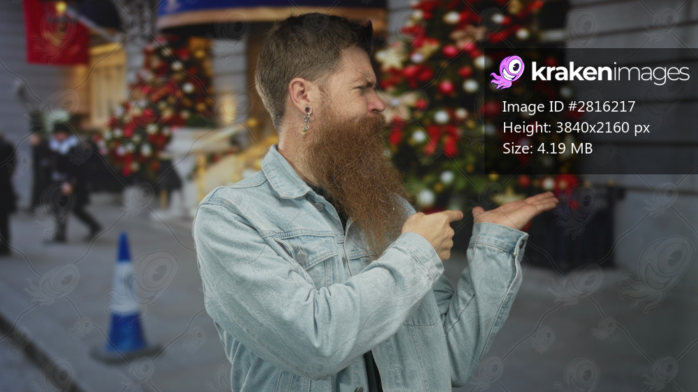 Man with thick beard wearing denim jacket points finger on busy city street near decorated christmas tree and traffic cone; confidence.