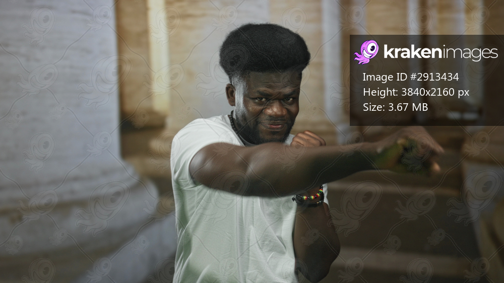 Man throws a punch with clenched fist in a building corridor framed by stone columns; confidence determination resilience.