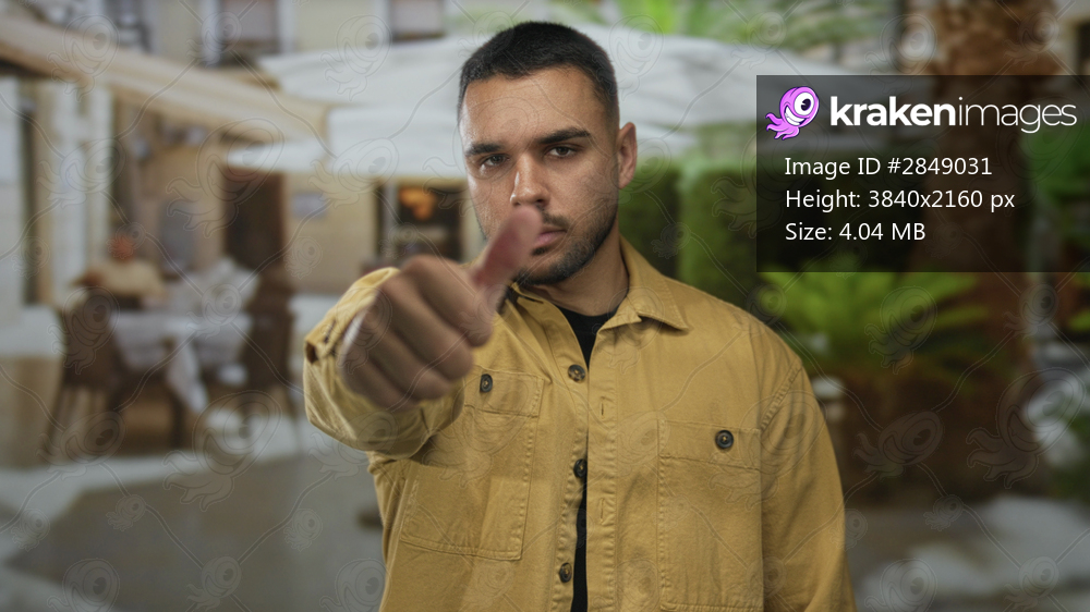 Man with thumb down gesture in sunny restaurant building terrace with blurred diners and green plants behind him; disapproval.