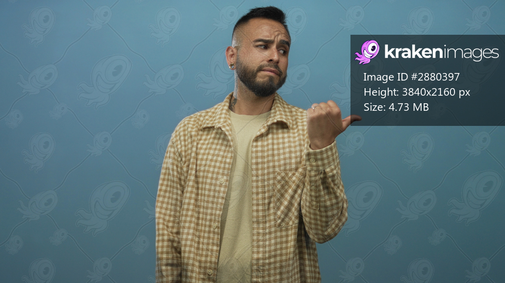 Man with thumb pointing over shoulder, visible hand and subtle grimace wearing checked shirt in a blue studio set; dismissive doubt.