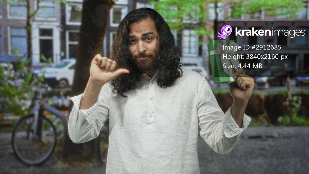 Man thumb pointing to chest holding green gift wearing white shirt on street in amsterdam; skepticism hesitation.