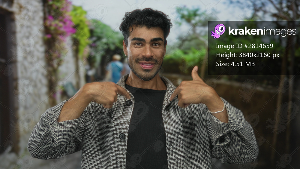 Man with thumbs pointing to chest in narrow urban street with leafy walls; confidence pride self assurance.