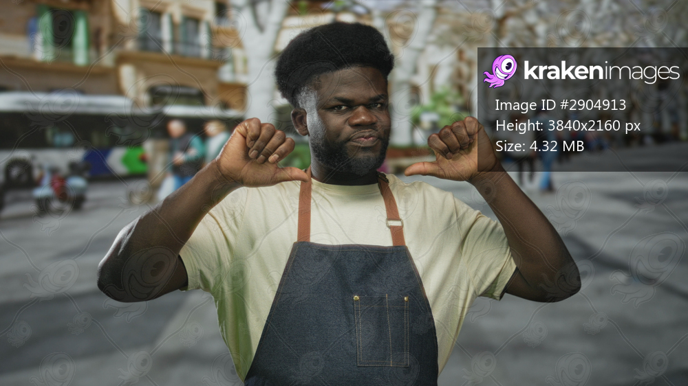 Man with thumbs pointing to chest on a busy street wearing apron and t shirt, squinting and smiling playfully; confidence.