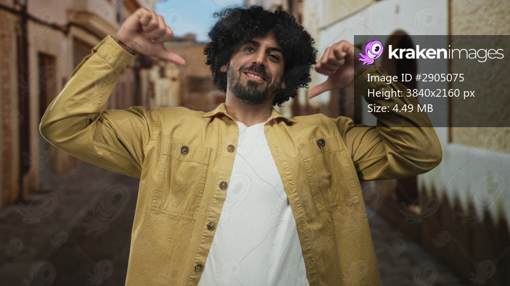 Man with thumbs pointing to chest on an old town street, curly hair and yellow jacket, smiling directly at camera; pride self belief.