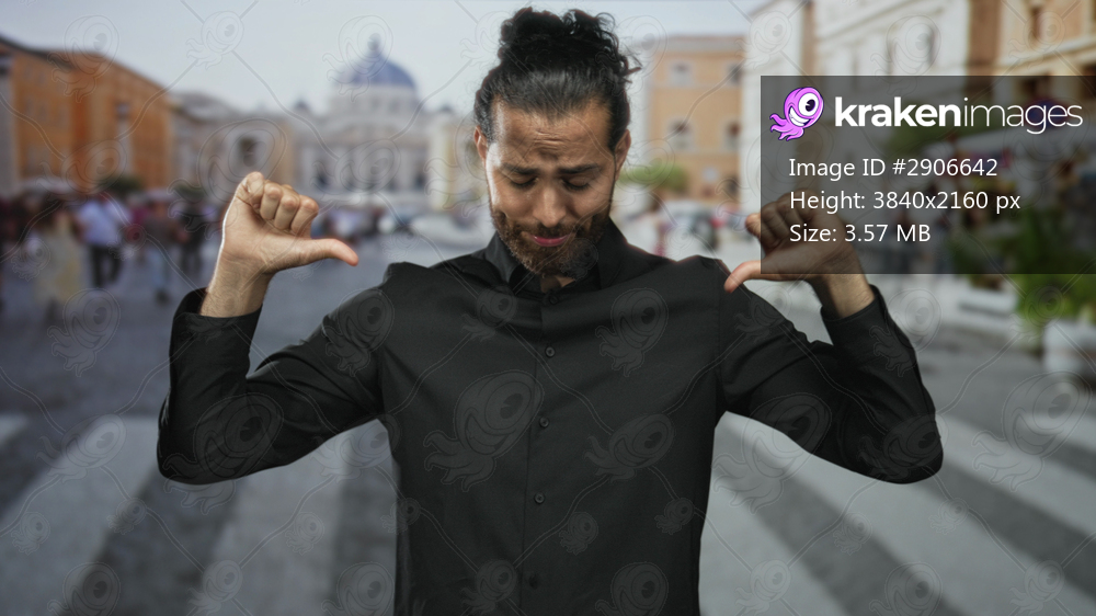 Man thumbs pointing to chest on street in front of saint peter building, pose and smirk; pride self assurance.