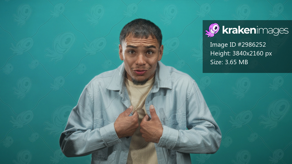 Man with thumbs to chest showing hands and slight smile in a teal studio wearing denim shirt and looking sideways; confidence pride.