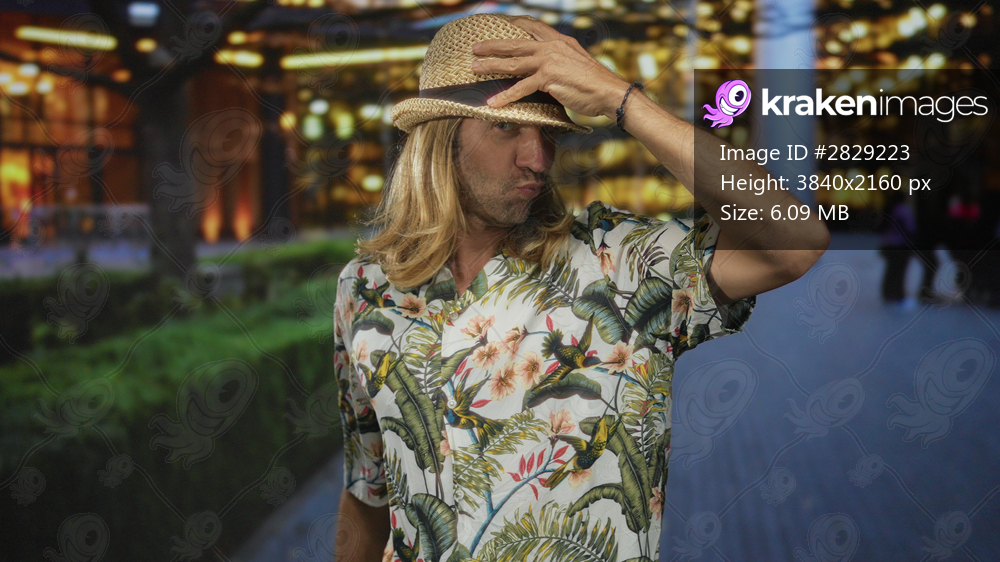 Man tilting straw hat with hand over his face on city street sidewalk against illuminated building facade; holiday enjoyment.