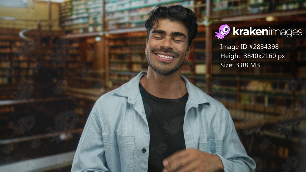 Man tilts head back with hand to mouth while laughing in a historic library with wooden bookshelves and spiral staircase; amusement.