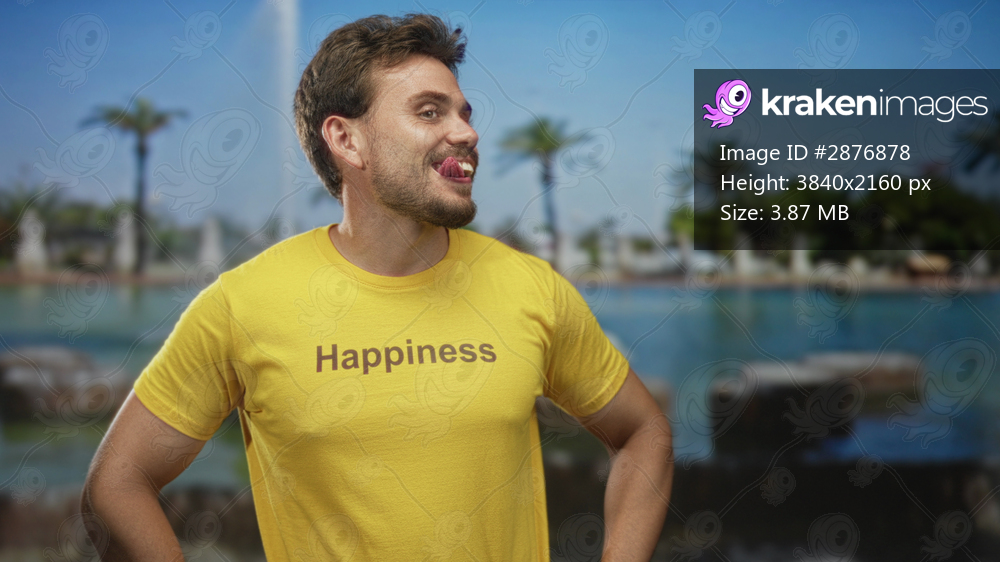 Man with tongue out and hands on hips in park by fountain wearing yellow tshirt reading happiness and smiling broadly at camera; joy confidence.