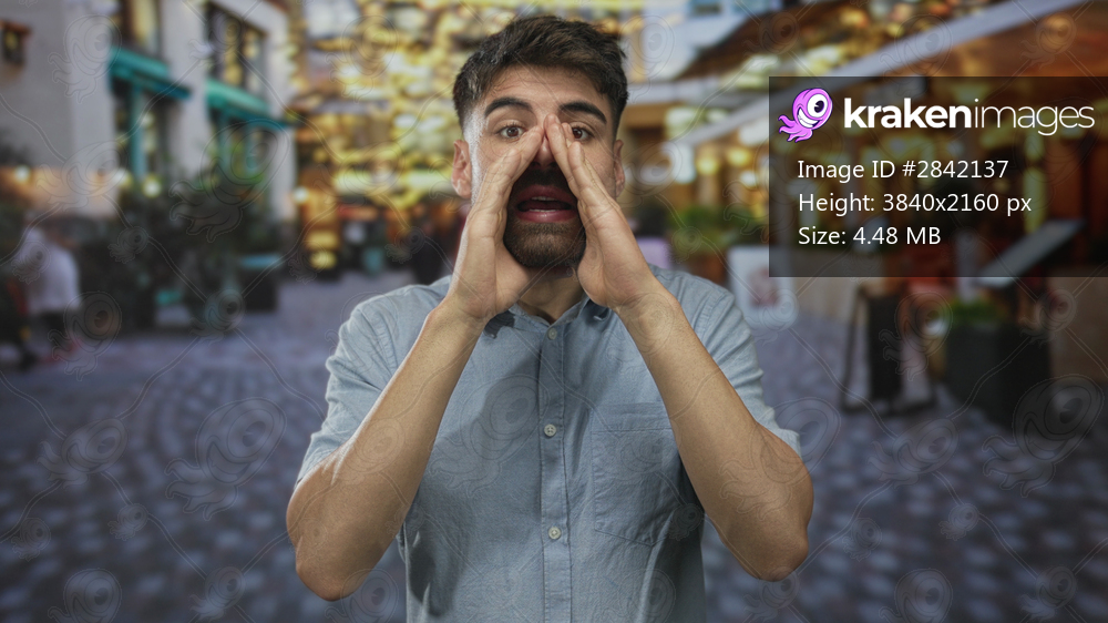 Man with tongue out waving hand on busy urban street under evening lights near storefronts; playful greeting.