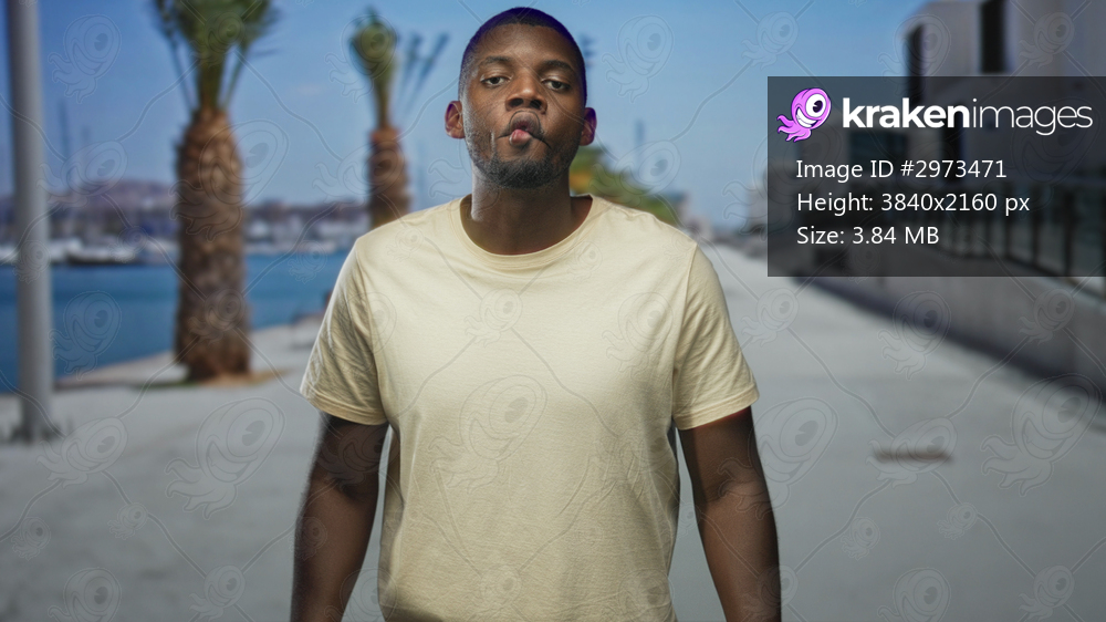 Man with tongue out wearing beige tshirt, standing center frame near palm trees and marina on a sunny street promenade; playful confidence.