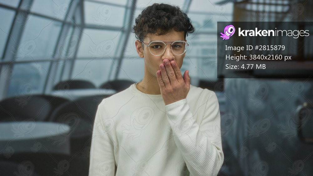 Man touches his lips with hand in modern restaurant interior while wearing glasses and white sweater and shows a silent gesture; introspection.