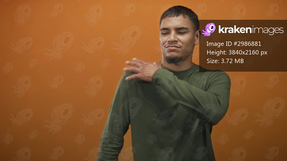 Man touches his shoulder with hand, rubbing and adjusting sleeve while shifting gaze and offering a subtle smirk in a studio orange set; calm confidence. - Kraken Images