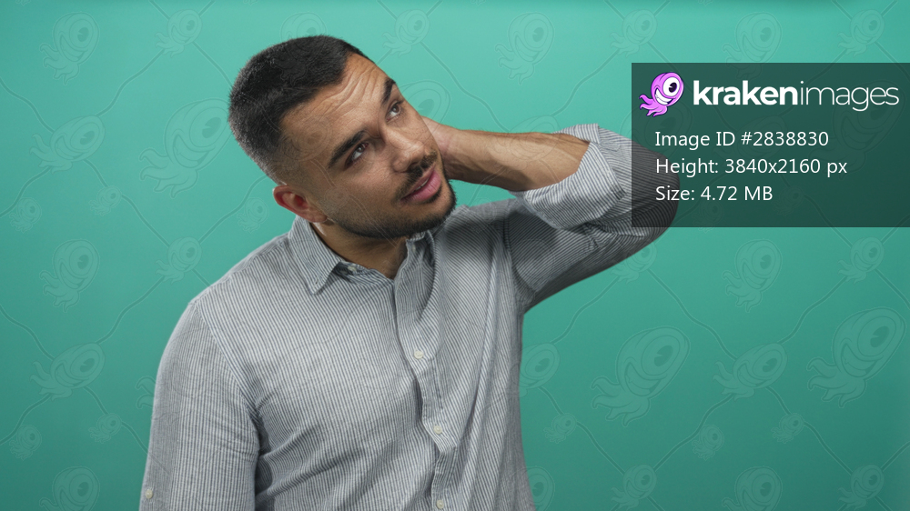 Man touches neck in studio, facing camera with slight smile, casual striped shirt and short hair; serenity.