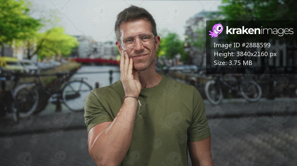 Man touching cheek with hand and closed eyes on cobbled street by amsterdam canal bridge with parked bicycles; discomfort toothache.