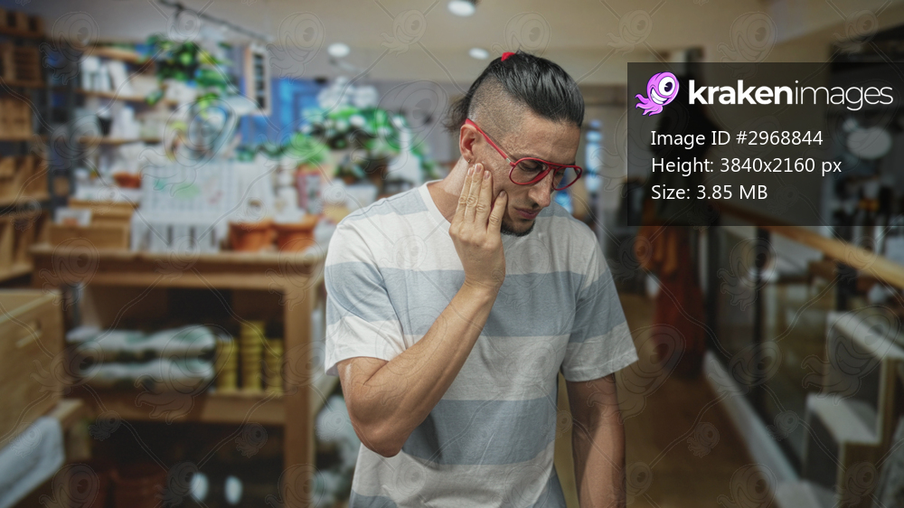 Man touching cheek with hand and red glasses in a building shop aisle, wincing with jaw pain and rubbing cheek; toothache discomfort.