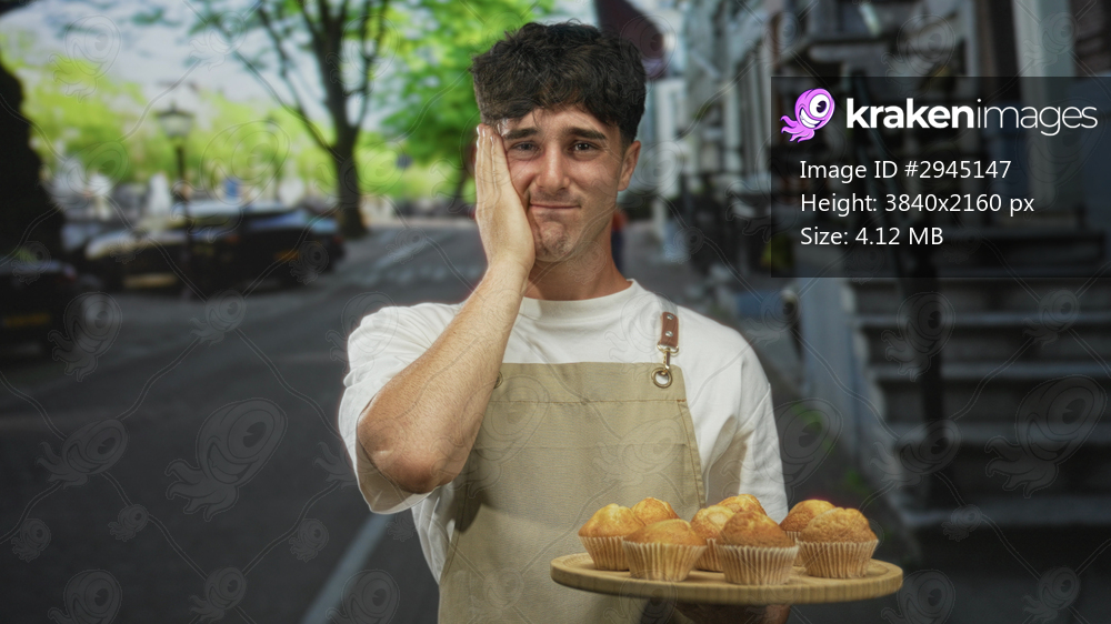 Man touching cheek while holding wooden tray of muffins on a city street near townhouse steps; concern responsibility.