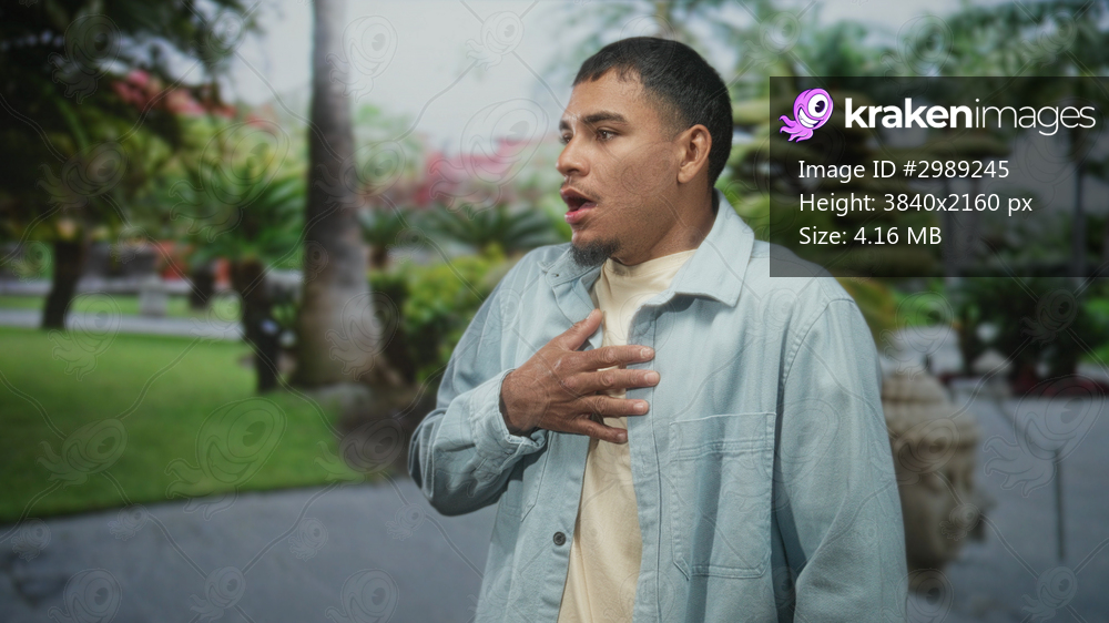 Man touching chest with hand showing surprised expression near building in a park with statue and palm trees, casual jacket visible; surprise.