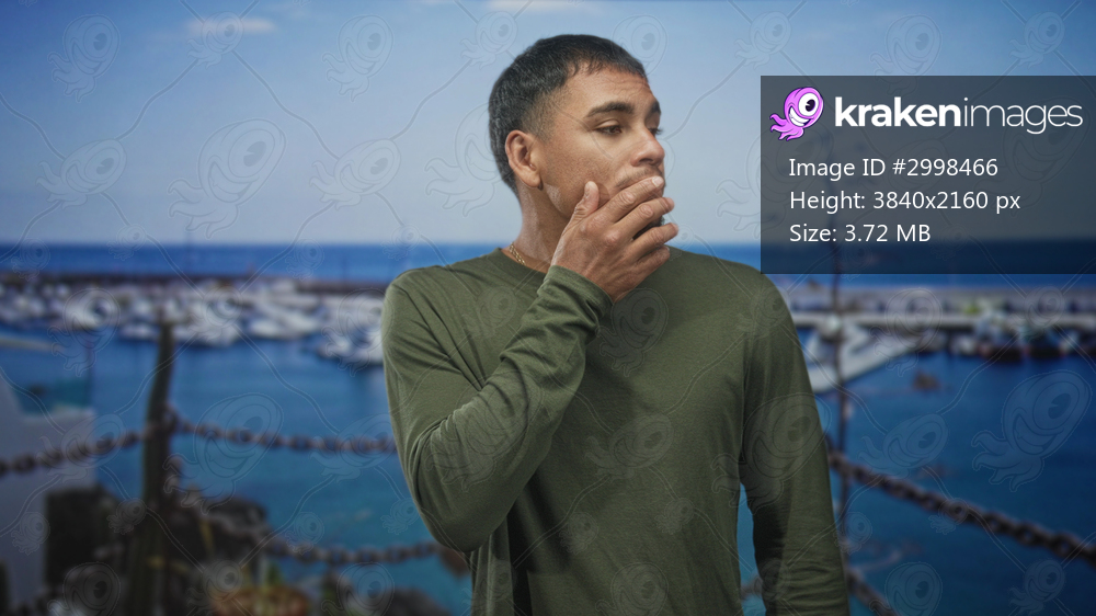 Man touching chin and covering mouth in a pondering gesture at a marina pier with boats and chain railing visible; contemplative doubt.