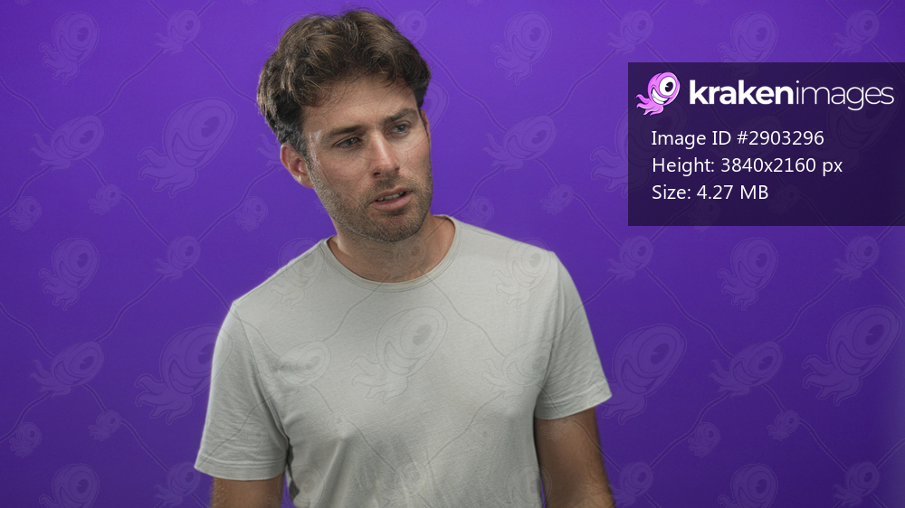 Man touching chin with finger while gazing to the side in purple studio wearing light grey tshirt and stubble on face; thinking.