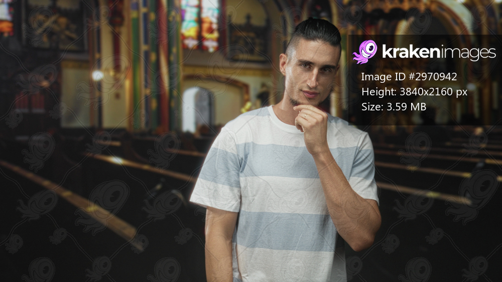 Man touching chin with hand in a church building wearing a striped t shirt, gaze directed forward; pensive reflection.