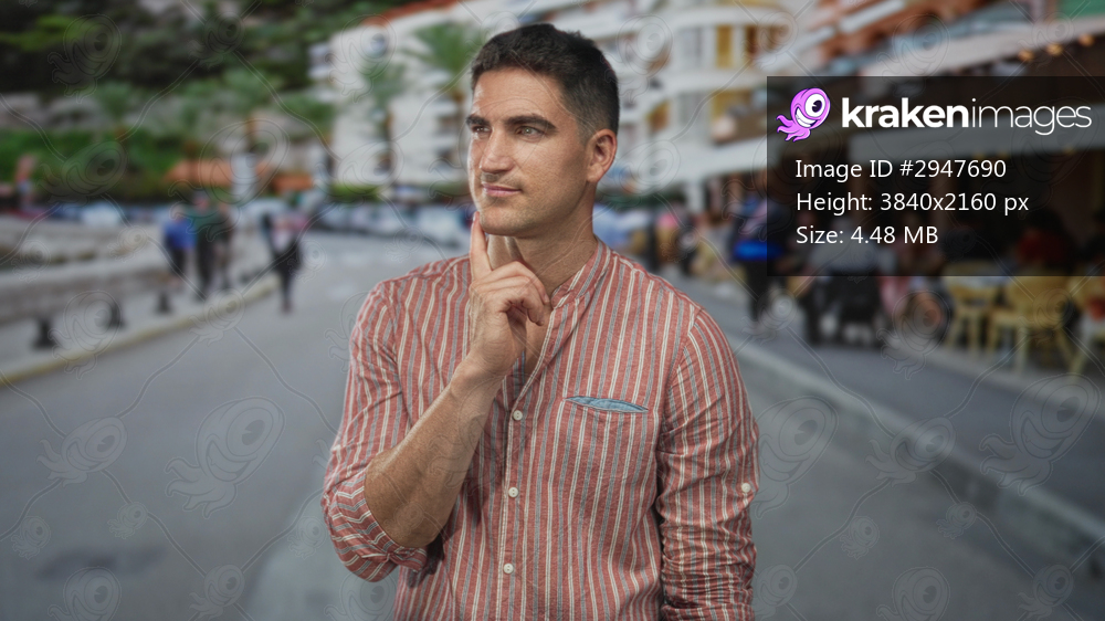 Man touching chin with index finger while wearing red striped shirt, standing on a busy street beside outdoor cafe seating and blurred pedestrians; thoughtful. - Kraken Images