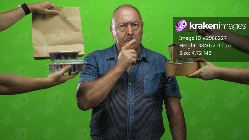 Man touching chin while multiple hands present takeout containers and a paper bag in a studio setting; thoughtful uncertainty.