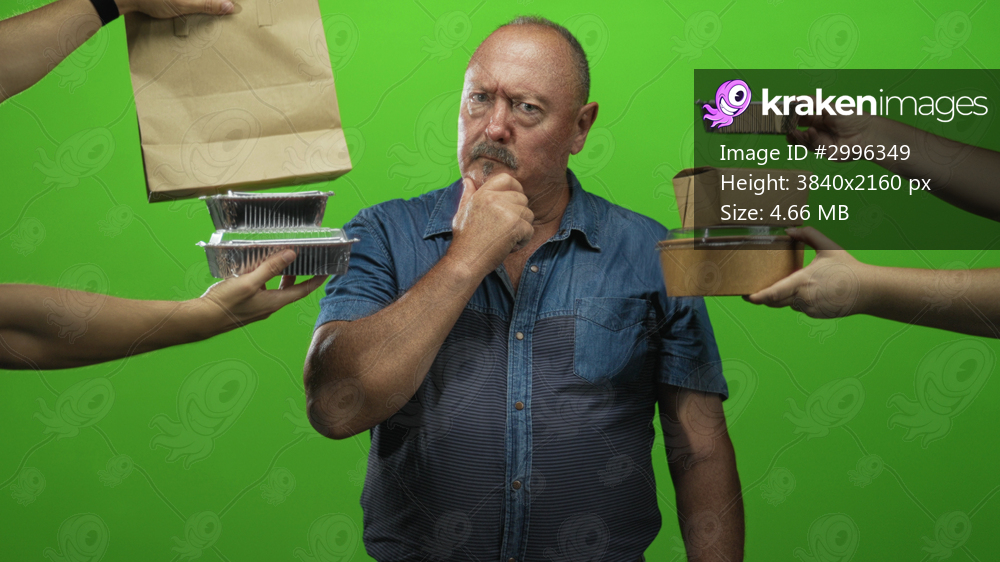 Man touching chin while multiple hands present takeout containers and a paper bag in a studio setting; thoughtful uncertainty.