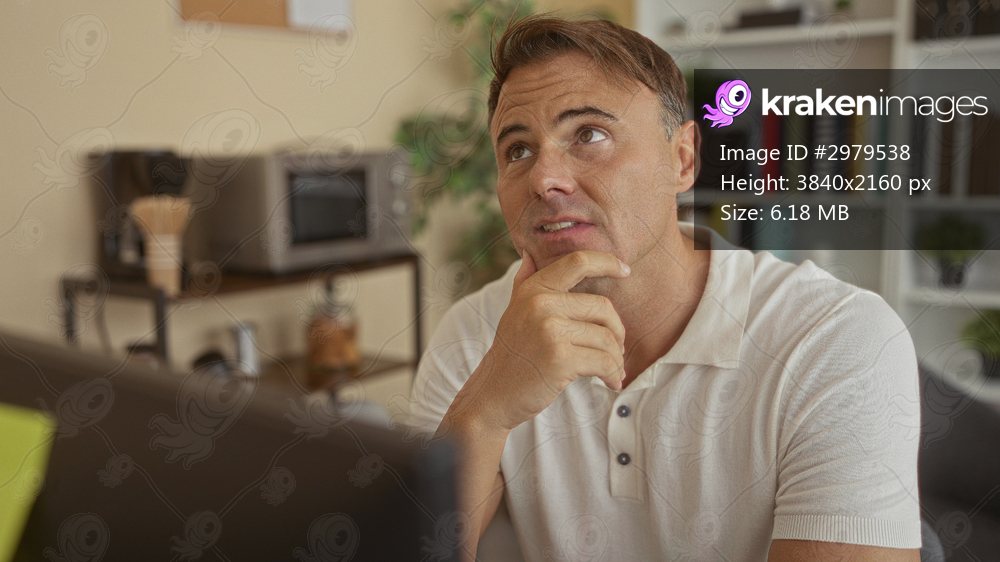 Man touching chin while seated at computer in a studio office with bookshelves and plant; thoughtful reflection.