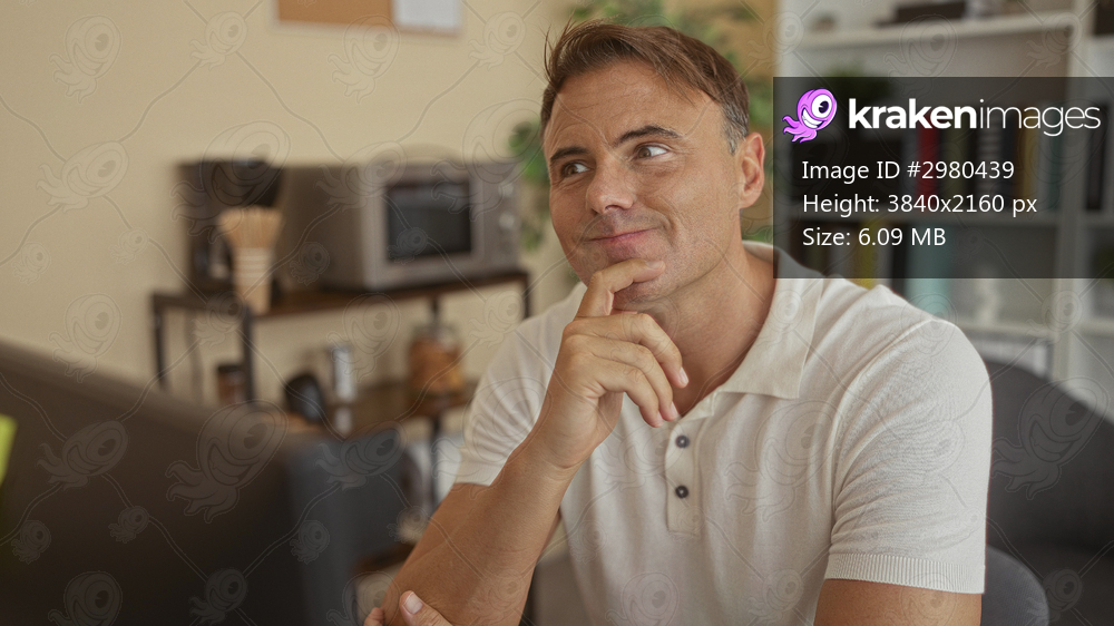 Man touching chin while seated at computer in a studio office with bookshelves and plant; thoughtful reflection.