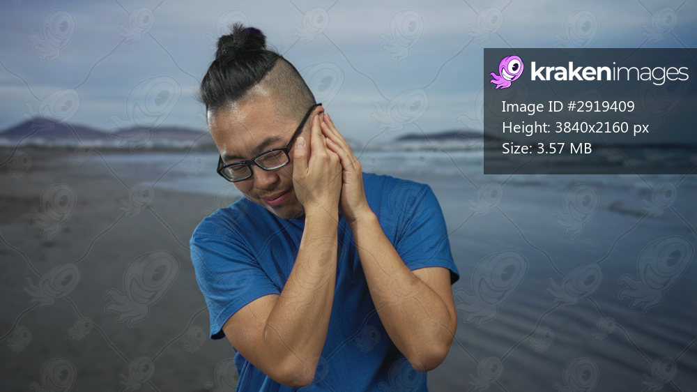 Man touching ear with both hands while wearing glasses and a blue tshirt on a sandy beach shoreline; earache discomfort.