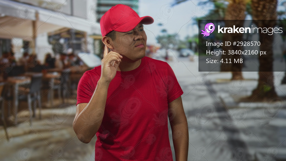 Man touching ear and gesturing with hand on street terrace outside a restaurant near outdoor tables and palm trees; mild confusion.