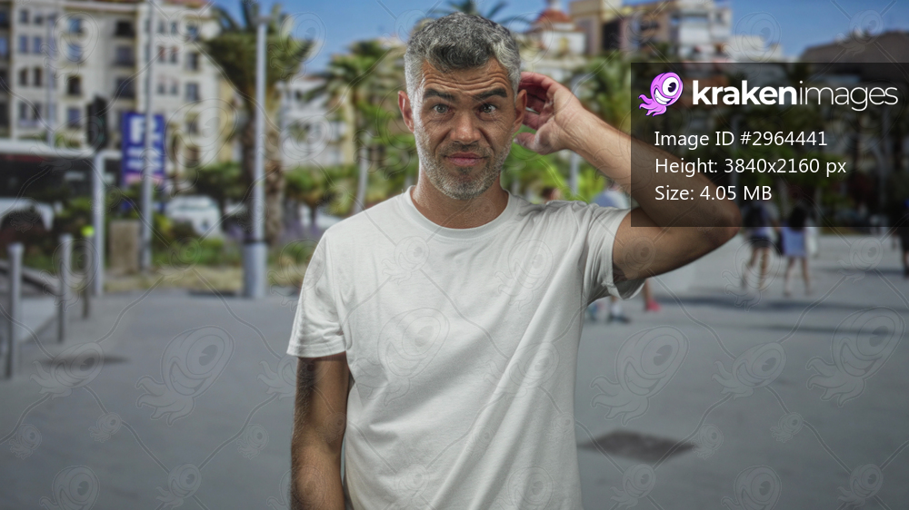 Man touching ear with hand behind head, wincing on a sunny street lined with palm trees and waterfront buildings; confusion doubt.