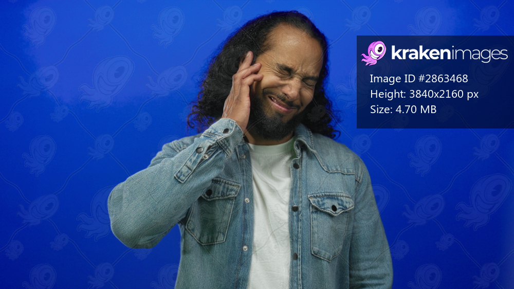 Man touching ear with hand in blue studio wearing denim jacket and white t shirt; discomfort introspection.