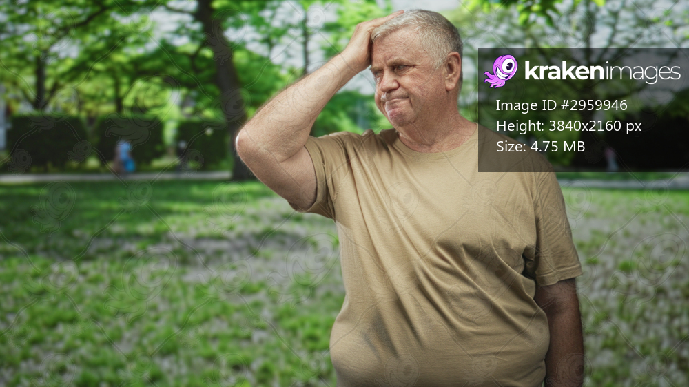 Man touching forehead with hand in forest, standing in a park with trees and grass, wearing beige tshirt, alone near hedge and bench; frustration.