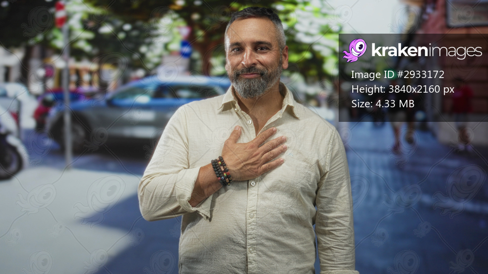 Man touching hand to chest on city street with beaded bracelets and linen shirt, slight smile; gratitude.