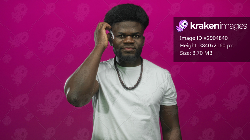 Man touching his ear with hand while wearing white t shirt and wooden bead necklace against magenta wall in studio; doubt.