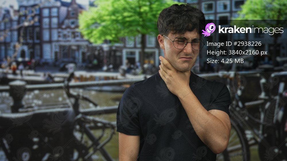 Man touching his neck for sore throat on street by amsterdam canal and bicycles in city; throat discomfort.