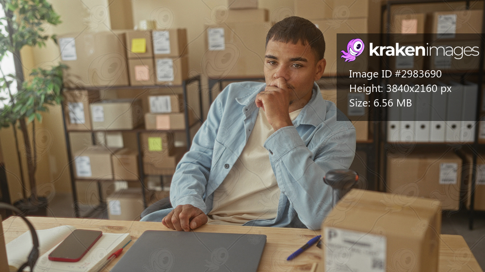 Man touching laptop, hand on chin while seated among boxes at a small business building; pensive planning.