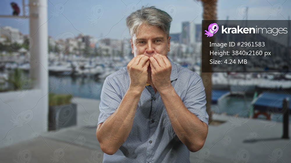 Man touching lips with fingers in a whistling gesture on a street by a marina with boats and a palm tree; playful leisure.