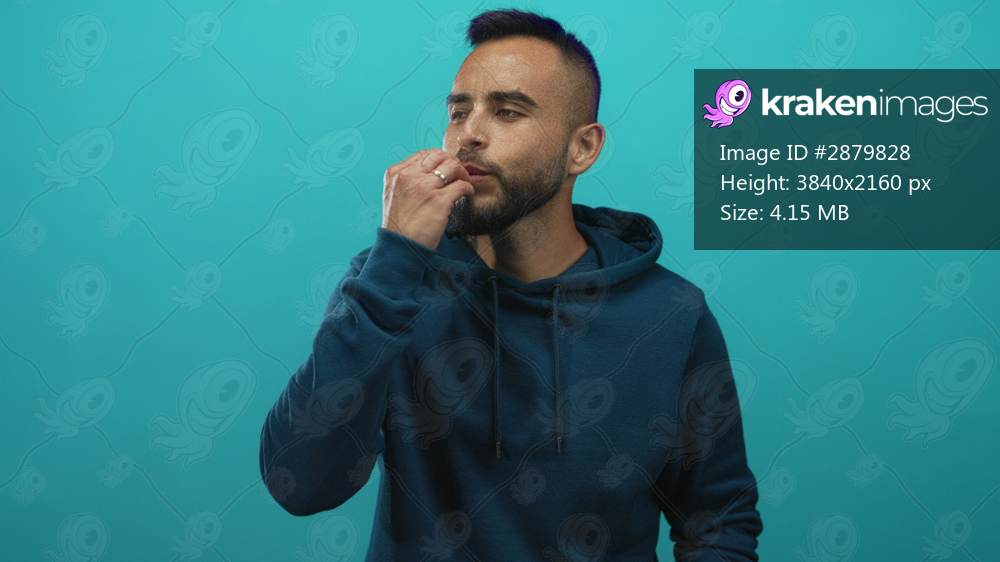 Man touching mouth with right hand and open palm gesture in turquoise studio, wearing navy hoodie and earring; introspection calm focus.