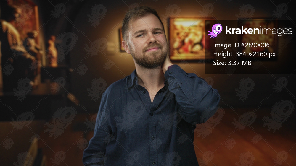 Man touching neck amid framed paintings in an art gallery building, smiling and tilting his head slightly; quiet contemplation.