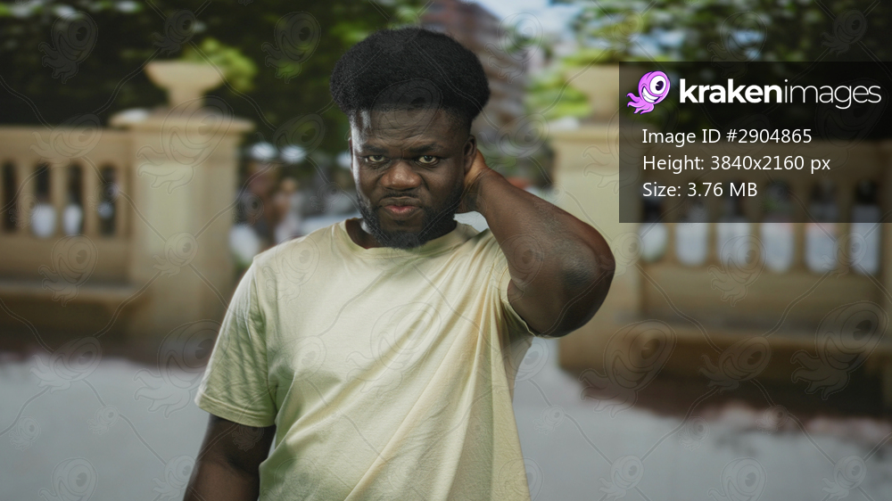 Man touching neck with right hand on street near stone balustrade, wearing light t shirt and slight smile; playful selfconscious.