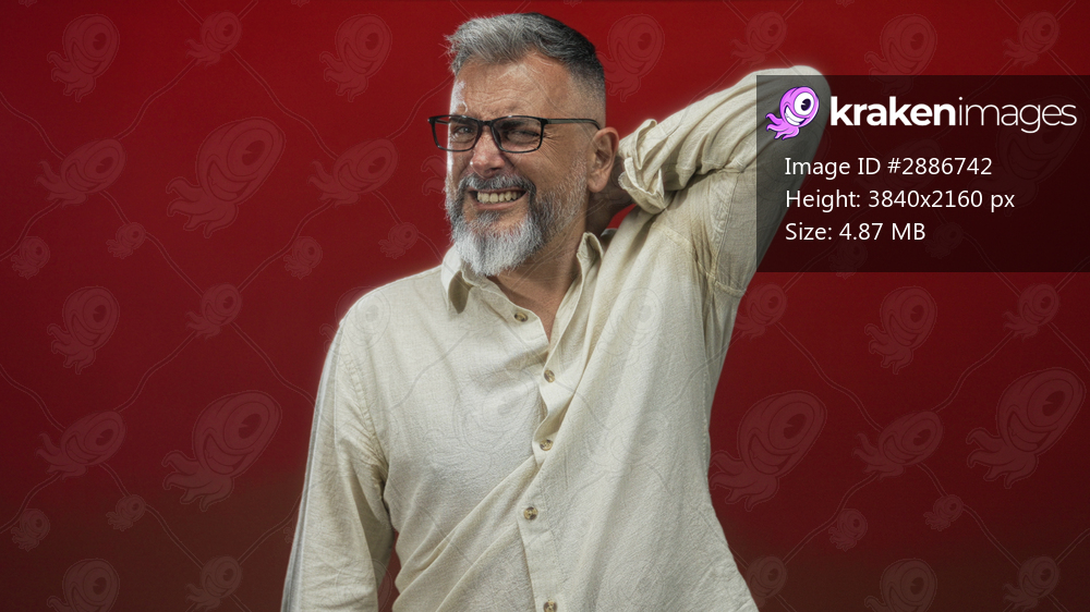 Man touching neck and wincing in a red studio while wearing glasses and a beige linen shirt; pain recovery.
