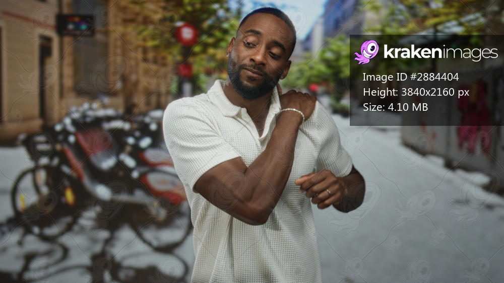 Man touching shoulder and adjusting his shirt on a sunlit street beside parked bikes and graffiti covered walls; quiet introspection.